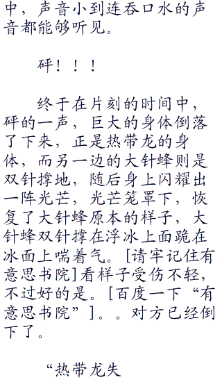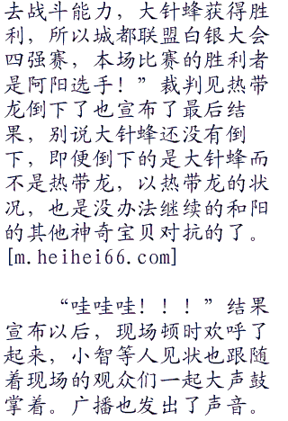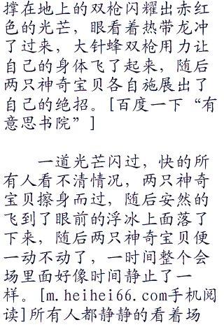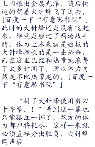 “大针蜂使用电光一闪的皇家枪杀!”阳见状知道也是时候分出胜负了,大针蜂双枪之上再度盘旋出了强大的气流,皇家枪杀再度出现,在电光一闪的加持之下,如同喷射的火箭一样,同时也增强的皇家枪杀的螺旋和威力,下一刻,大针蜂与绿叶风暴冲击在一起。