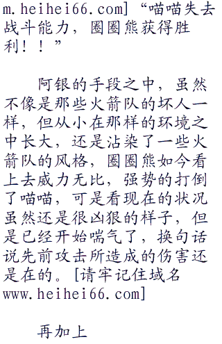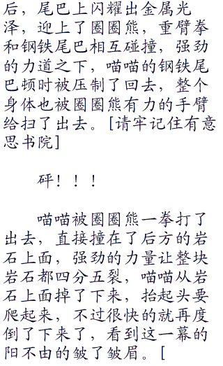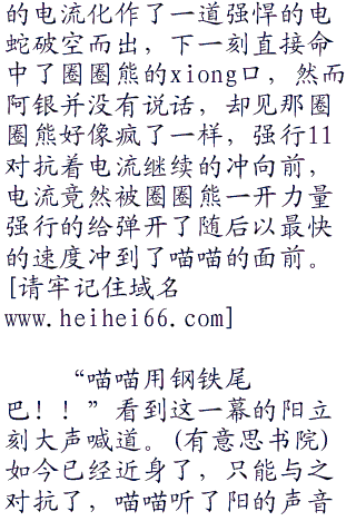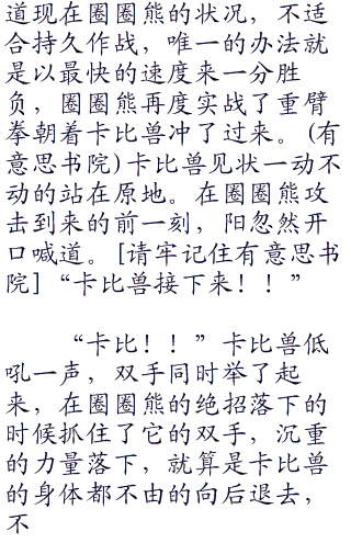 “圈圈熊使用重臂拳!!”观众席上众人解释的同时,阿银的攻势已经开始发动了,只见圈圈熊大吼一声,好像不受电流麻痹的影响一样。整条手臂上闪耀着枯黄色的光芒,直接正面朝着喵喵冲了过去。这样的直接攻击,说实话并没有什么套路,很容易被阻止,也很容易被打断。