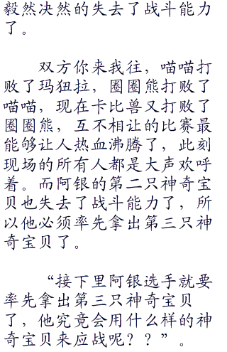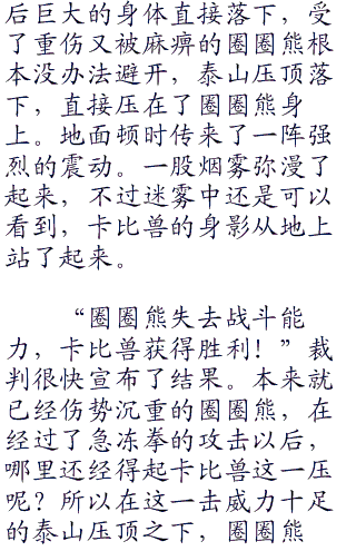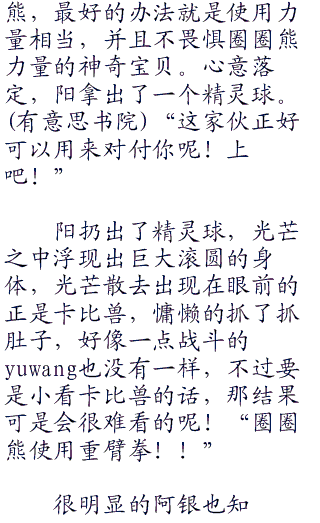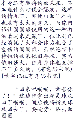 “异常状态绝招威力递减吗?但还是必须用电系绝招,喵喵用十万伏特!”尽管因为圈圈熊特性的发动,电系绝招的威力变得不佳,但是圈圈熊始终是已经被麻痹了,如此一来,继续使用电系攻击的话,那圈圈熊的麻痹状态就会增强,毅力是在异常状态下能够增强攻击力的绝招,但并非是异常状态就此消失。