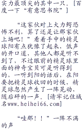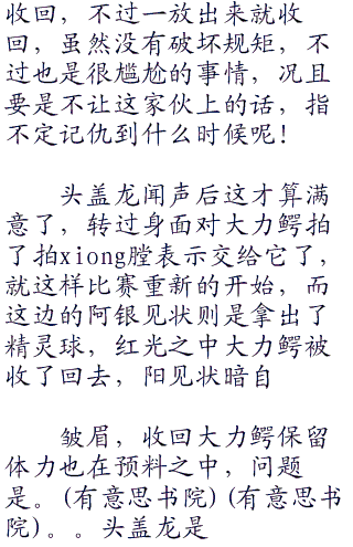 “卡比兽失去战斗能力,大力鳄获得胜利!”裁判见状举起了旗帜宣布了比赛的结果。这样一来阳也失去了三只神奇宝贝了,阳见状将精灵球拿了出来收回了卡比兽。随后看向了场中的大力鳄,这只大力鳄果然比其他神奇宝贝要强大的多,虽然这场比赛大多是由卡比兽自己混乱造成的。