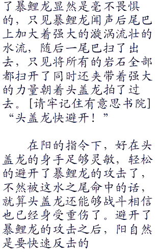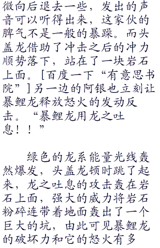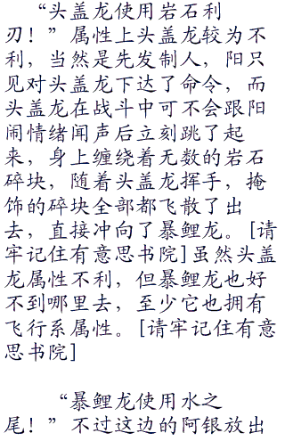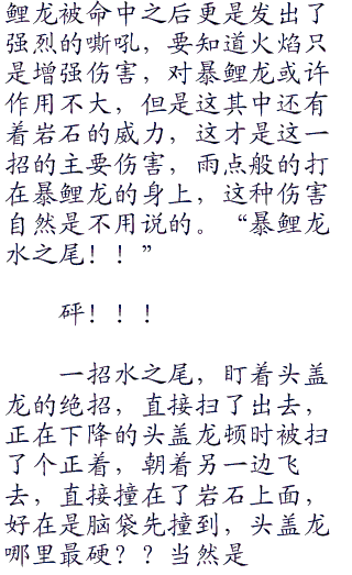 “好机会,大力鳄使用高压水泵!!”趁着卡比兽把自己打飞的同时,阿银顺势发动攻击,高压水泵再度爆发,倒退中的卡比兽直接被高压水泵梦中,整个巨大的身体都被带动了起来,连续撞碎了身后的两块岩石,才在第三块岩石上面停了下来。随后卡比兽身体朝着前方倒下。