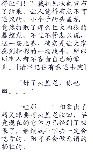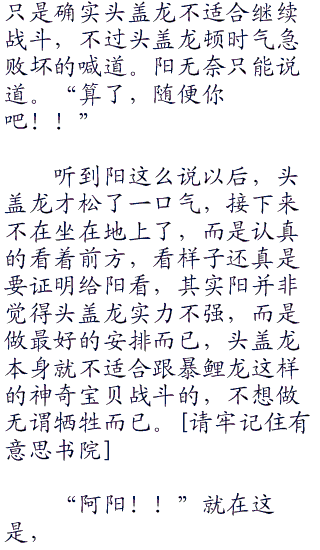 好在头盖龙的脑袋够硬,撞在岩石上面,岩石碎了,头盖龙却没有太大伤害,主要的还是先前的那一下水之尾,这对头盖龙来说才是真正严重的伤害呢!头盖龙有点吃力的从地上爬了起来,刚刚那一下可是不轻,起身之后头盖龙满脸不爽的看着暴鲤龙,不过那么小的家伙,露出那么凶狠的表情看着那么大的暴鲤龙实在是有点违和了。
