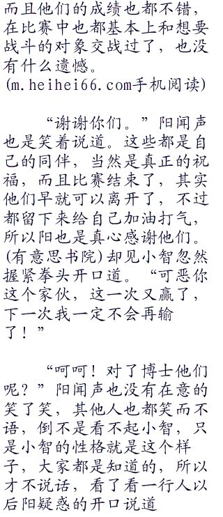 “谢谢!!”阳见状只是很简单的回应道。简单虽然简单,不过两人现在都不需要多说什么,在战斗已经很清楚了,随后量身同时伸出手握了握手,在众人的欢呼声中退场了,而在两人比赛结束的同时,也就说明,这一次的白银大会,到此就要结束了,至少最后也给所有人呈现了一场精彩的比赛。