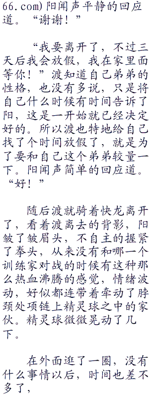 “真是的,卡米姐又来了!”此时伊宿雷纹市的雷纹道馆的房间中,传来了欢快是声音,两个妹纸站在门外一阵无语,上一次也是这样这一次又是这样,不过看这个样子,似乎是她们馆主喜欢的男生又拿到了冠军了呢!看来这家伙还真是厉害呢!毕竟就算是她们的馆主去参加大会,也不一定赢的冠军。