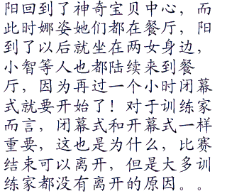 “不用客气!!”乔伊小姐闻声温和的笑着说道。随后就带着阳的精灵球离开了,与此同时小智等人也都回来了,因为退场的时候人比较挤,所以他们回来比参赛的阳和阿银要慢得多了,阿银把神奇宝贝交给乔伊小姐后,担心大力鳄的状况就跟过去了。