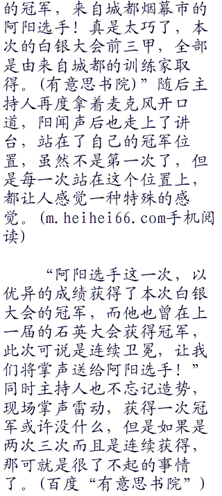 “接下来有请本次大会第二名,城都若叶镇的阿银选手上台领奖!”接下来白银大会的第二名自然是阿银了,达马岚其将奖杯送到了站上台的阿银的手中,这是阿银第一次得到的奖,虽然是第二名,但是看着手中银白色的奖杯,对于他来说却是有意义的,或许是因为名字的关系,看着这个奖杯他并没有因而是第二名的江边而嫌弃。