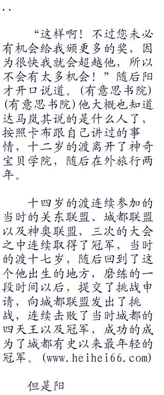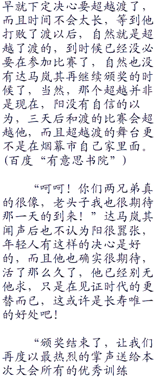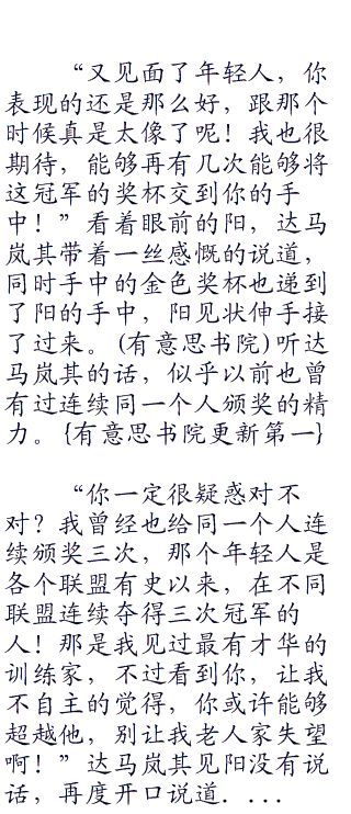 “咳咳,各位本次白银大会参赛的训练家们你们好,我是达马岚其,本次的白银大会举办相当成功,各位也都在本场大会上有了优越的表现,无论是晋级还是没有晋级,都希望各位以后能够继续自己的梦想和道路,那么现在,我们将为本次大会的前三名选手颁奖!“零零零””