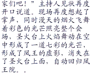 吃完了晚餐后,众人就一起前往了白银会场,此时会场里面已经都收拾好了,大概的布置和开幕式并没有什么不同,闭幕式当然也是颁奖典礼,所有的训练家到场以后,都有秩序的排列好位置,随后就是由联盟长老,看管圣火的达马岚其会长上台讲话了。