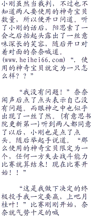 “是这样吗?师傅请你跟我做一场比赛!”这个时候奈奈忽然站了起来对着阳开口道。阳倒是微微一愣,似乎从刚认识的时候的那一次比赛,之后两人就没有过正规的比赛,就是平时修行的时候的对练而已,那只是绝招的联系,连将但对方打晕都没有过的。