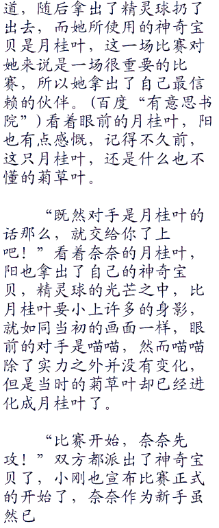 “师傅,对于每一个训练家来说,参加比赛就是最终的目标吗?这几天我一直在想,如果是我自己参加比赛会怎样?看着每一个训练家淘汰晋级,还有热血沸腾的战斗,那个时候,我自己也感觉到了,自己体内的血液好像在跳动一样,那是跟我在看棒球比赛时候一样的感觉!”
