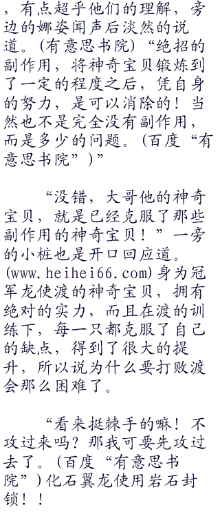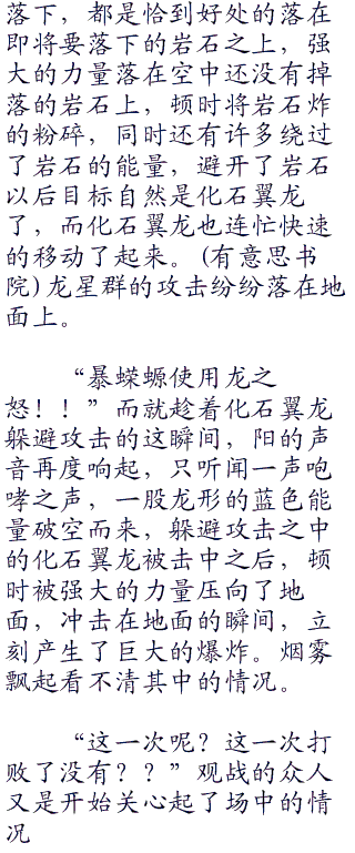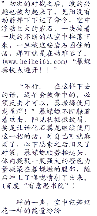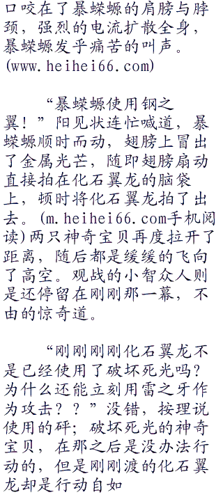 只见砰的一声,护罩应声碎裂,化石翼龙再也没办法保护自己,暴蝾螈的抓住顺势进入其中,一爪子拍在了化石翼龙的身上,强劲的力量顿时让化石翼龙倒飞了出去,比赛的刚开始,阳利用自己的先手强攻化石翼龙,并且获得了成功,这让大家感到很惊讶,要知道阳的对手可是渡呢!