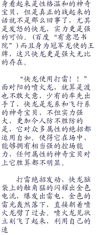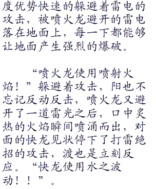 “喷火龙龙神俯冲!”看到这一幕的阳对着喷火龙喊道,喷火龙闻声之后飞上了空中,伴随着一声咆哮,由蓝色光芒形成了巨大飞龙,夹带着强烈的咆哮声从空中落下,眼看着就要将渡的喷火龙给吞噬掉了,但是渡也不会坐以待毙!“喷火龙使用烈焰突击.!”