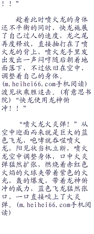 “喷火龙使用龙之爪!”临近之后,两只神奇宝贝同样使出了进展绝招,在空中你来我往两只神奇宝贝不相上下的较量着,一下喷火龙被快龙击中,一下子快龙又被喷火龙打退,看得观战的众人,忘记了抬着脑袋的幸苦,眼中只有两只神奇宝贝交战时候的身影。