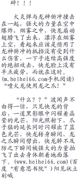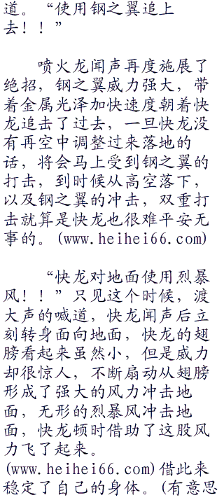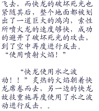 扇动翅膀一瞬间快龙便窜到了空中,喷射火焰命中地面,被快龙成功的避开了,作为最快的神奇宝贝之一,快速的速度在神奇宝贝之中少有能够匹敌的,想要命中绝非易事,除非拥有同样的速度,而喷火龙就是这样的神奇宝贝。“喷火龙快点追上去!!”