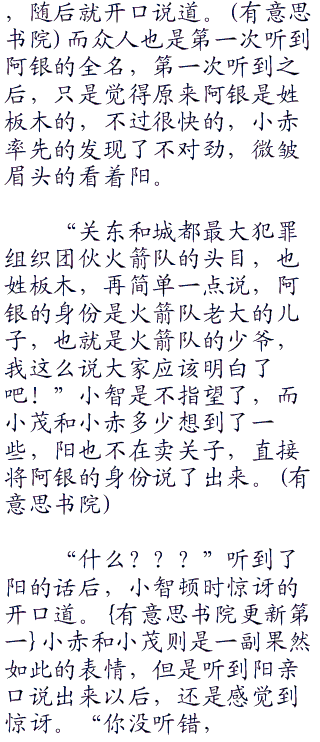 “我就长话短说吧!首先阿银不来自若叶镇,他的全名叫做板木银!”阳思索了一阵,也没打算隐瞒大家