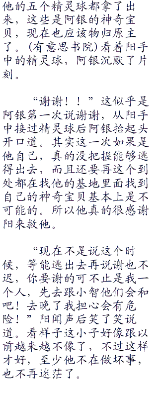 “小智小赤干得好!好了,我们也走,梦幻交给你了。”随后阳就对着身边的梦幻说道,梦幻一出,立刻飞到了那一队火箭队队员的身前,超能力再度施展,只见几名火箭队的成员毫无预兆的瘫软下来倒在了地上。阳见状玛狃拉的带路下继续前进着。