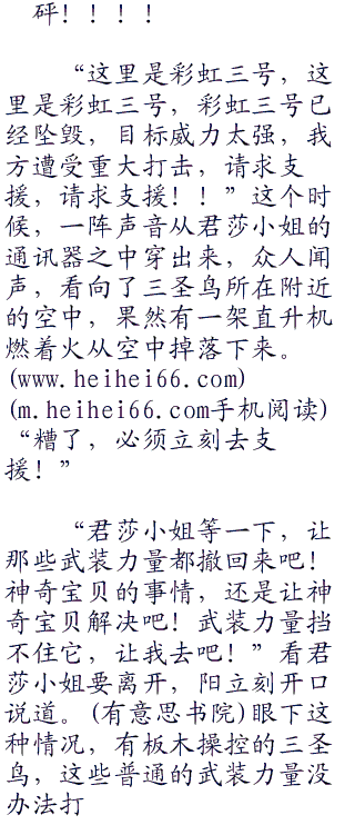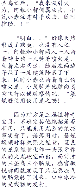 “好的我们明白了!那么那个神奇宝贝到底是!!”君莎小姐闻声后点了点头。随后指着空中在肆意破坏的三圣鸟说道。现在最重要的是阻止它,但是首先也要先了解一下状况才可以。闻声后阿银率先说道。“那是利用邪恶融合基因技术,将三圣鸟融合之后的融合体!”