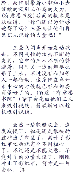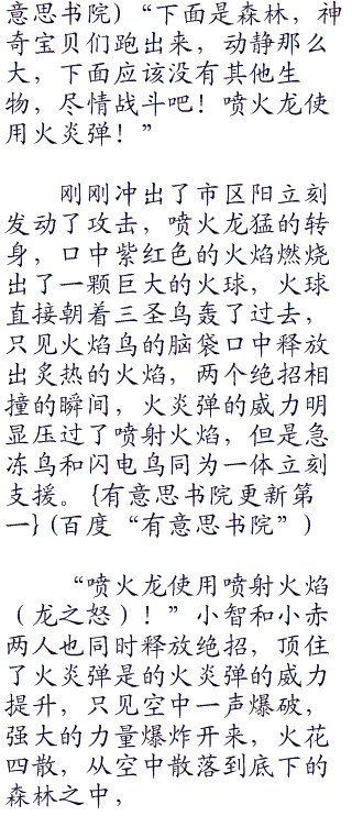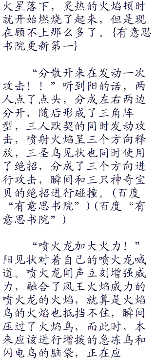 “看来近战的话,想要对三圣鸟造成大伤害,必须要连续攻击,想要对三圣鸟造成连续攻击太难了!转移战场,先到市外再说吧!”看到这一幕以后,阳对着众人喊道。众人闻声后在通讯器之中回应道。随后阳就再度喊道。“喷火龙使用喷射火焰!!”