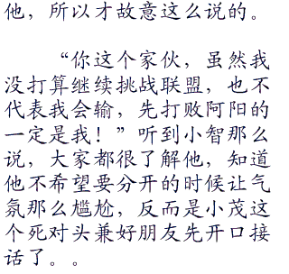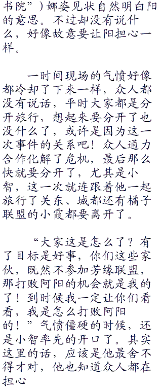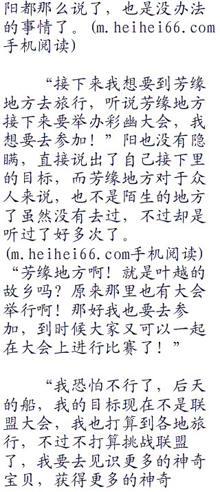 “是吗??真是太可惜了。不过阳你说你有了什么目标??”听到阳那么说,小智顿时有点失望,要知道当时可是二比二的平手呢!而且阳也拿出了最强的喷火龙了,最后的结果实在很难说,现在看不到的难免觉得有一些可惜,不过既然