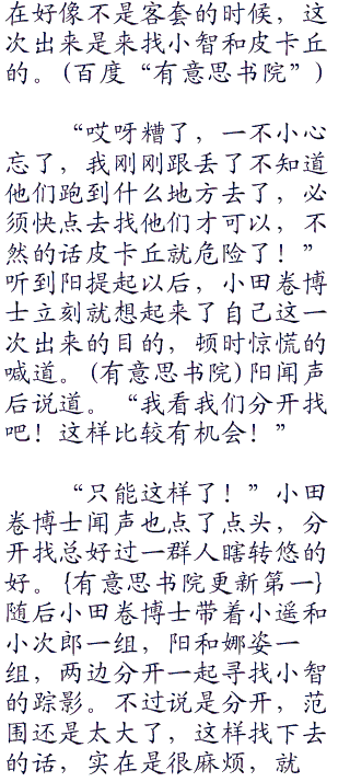 “是吗?是他们过奖了,他们也都是很优秀的训练家,哦对了其实出来找博士是因为小智的事情,不知道小智现在在哪里?”原来是他们两个告诉小田卷博士的,那倒是不奇怪了,不过忽然想到,现