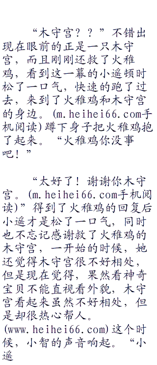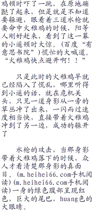 一只追赶不上,露力丽跳进了一对草丛之中,火稚鸡气急败坏之下,顿时张开嘴,口中吐出了无数的炙热的火花,火花冲进了草丛之中,就听见一阵痛呼的声音,火稚鸡闻声道是成功了,兴奋的朝着草丛后面跑去,却在穿越草丛的同时愣在了原地,因为眼前