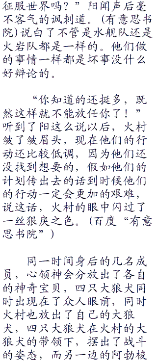 “看来是白忙活一场了吧!找到你们要的答案了吗?找不到它的踪迹很失望吧??火岩队三干部火村!”看着出现眼前的男子,阳平静的开口说道。小智闻声有点惊讶的看着阳,他没想到阳会知道对方的身份,不过阳是御龙家的,似乎对于很多邪恶组织都很了解的样子。