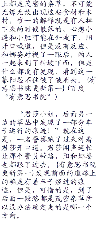 “有什么发现吗?”这个时候君莎也赶了过来了,其他队员抓紧在其他地方检查,而君莎则是来到了阳的身边开口问道。阳将手中的木材放下站起身来说道。“这些应该是我同伴收集的食材和木材,看样子应该是匆忙之下,从斜坡上面下去的!小遥、小胜!!”