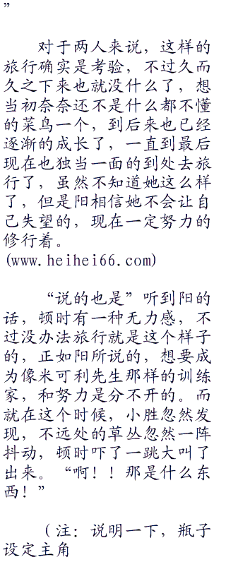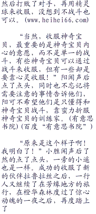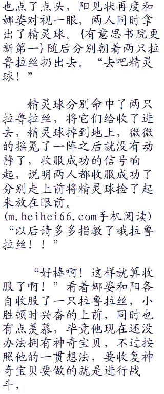 “它们好像不舍得我们离开的样子呢!”一旁的小胜也是开口说道。其实相处的时间不长,不过小胜那么喜欢神奇宝贝,也是舍不得的,而现在看它们的样子,更是舍不得,阳见状转过头去看着娜姿。娜姿见状好像知道阳的想法一样,微微点了点头。阳见状转过头对着拉鲁拉丝说道。“你们愿意跟我们一起走吗?”