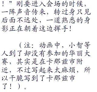 “按照地图显示,这里到卡那兹市只需要十分钟左右的时间就可以到了!”小胜也是希望能快点到城市里面去,当初离开的时候的东西在这几天里面也都用的差不多了也是需要补充的时候了,最重要的是,来“零零零”到了卡那兹市以后,阳就要去挑战卡那兹道馆了,这是他最期待的。