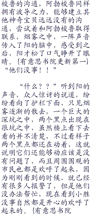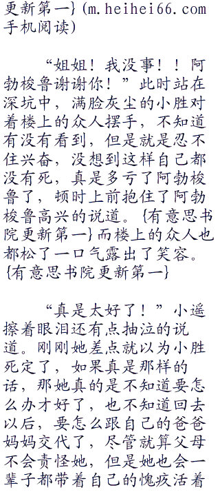 强大的破坏力产生的爆炸,烟雾掩盖了大范围的地面,阿勃梭鲁和小胜掉落到了烟雾之中,随后就失去了动静了,周围的人群顿时都围了过来,看着下面一个一个的小黑点,楼上的众人都是站在护栏边紧紧的盯着楼下烟雾所在的位置,小遥闭着眼睛,缩在娜姿的怀中不敢睁开眼睛去看,生怕看到自己不想看到的一幕。