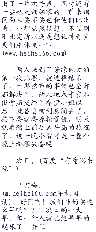 “呃。。呵呵有吗?我都打输了!”小智闻声不好意思的挠了挠头,毕竟虽然表现的不错,但还是输了,不由得让他有点怀疑,自己真的有进步吗??只见小胜已经先小遥和娜姿一步从观众席上面跳了下来说道。“那是当然啊!没有进步的话,是不可能打出那么精彩的比赛了,不信的话,你看看四周啊!”