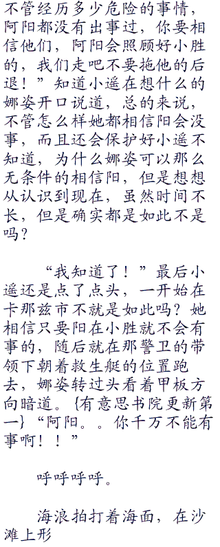 跑到了护栏边,一手按在了护栏上面,随后直接从上方护栏上面翻了过去,身体直接朝着船上落下要去追小胜,而此时的小胜已经噗通的一声掉落到了海中了,后方的阿勃梭鲁也是紧随其后毫不犹豫的追了上来,直接跳了出来紧随其后,阳掉入到了海水,阿勃梭鲁也紧跟进入海中。