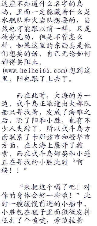 “呜!!”同样是海边,昏迷之中醒来,迷茫的看了看四周,周围的一切都是陌生的,摇了摇脑袋让自己更清醒一点,阳知道,这一次直接又流落海岛的样子了,只是不知道是武斗岛还是什么地方,只是记得,一开始的时候,自己在海中寻找小胜,后来客船发生了爆炸,强烈的震动产生的大浪把他给拍走了。
