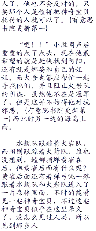 则是从他送给小胜的神奇宝贝精灵蛋就可以看得出来了,那是自己的神奇宝贝的巨金怪的后代精灵蛋,包括阳等人的那些精灵蛋,大多也都是他的神奇宝贝的后代,是他交给父亲保管的,当然交给了父亲保管,父亲送