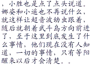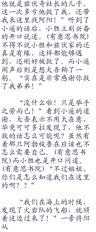 “嗨小胜!!”就在这是,一道声音传来,小胜闻声一愣,不过立刻看向了大海的方向,只见一艘快艇正快速的朝着这里靠近,远远看去就能够看到一道熟悉的身影在朝着自己挥手,不是小遥又是谁呢?而看到了这一幕的小胜也是兴奋的喊了起来。“姐姐!!”