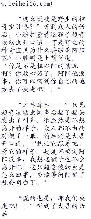 “你放心好了,你的朋友没事,只是体力耗尽了而已,带他去神奇宝贝中心,帮他补充消耗的体力,很快就可以恢复过来了!”检查了一下阳的身体状况之后,大吾对着一旁的小胜说道。而小胜闻声后也终于松了一口气,要不是为了救自己的话也不会是现在的状况,所以心中认为都是自己的原因。“真是太好了!”