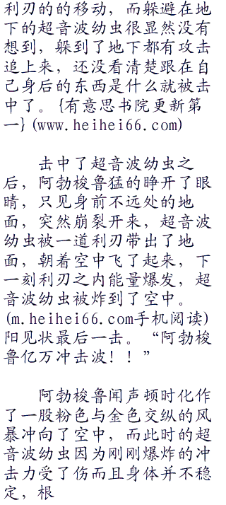 “库咔!!”听到了阳的话后,超音波幼虫也没有犹豫,只见双翅之上闪耀出银白色的光芒,同时发出了一阵刺耳的声音,随后双翅一挥双翅拍击在一起形成了一股强烈的音波,音波形成了实质性的能量化作半月形的能量冲击波。阳见状开口道。“音爆吗?阿勃梭鲁避开来!!”