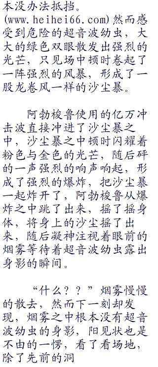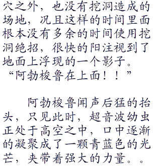 冲击地面的同时,没有预想的和地面撞击,而是冲撞在地面上之后以极快的速度钻入了地下,那是挖地洞绝招,超音波幼虫使用挖地绝招消失后,阿勃梭鲁四处张望着想要寻找超音波幼虫的位置,阳见状对着阿勃梭鲁喊道。“阿勃梭鲁,不要慌,凭你的感觉寻找超音波幼虫的位置!”