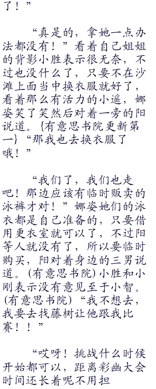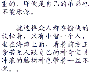 “说的也是,我都感觉这几天身体都快散架了!我们就一起去玩吧!”小胜闻声后也是同意了阳的建议,一行人也多理会小智,直接朝着海边走去。而留在原地的小智则是更加不爽的说道。“可恶怎么连阿阳也这样,这种时候可不是玩的时候,挑战道馆才是最重要的好不好!你们这些家伙等等我!”
