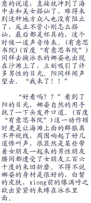 在海滩上晒太阳做沙浴、躺在沙滩椅上面,在遮阳伞下安静的午睡和看书,在浅滩上有用,在海浪之中冲浪,的确是一种来到了度假小岛的享受,说这话小遥立刻就开始脱衣服了,小胜见状顿时大惊,连忙对着小遥喊道。“姐姐不可以再这里脱衣服啦!!”