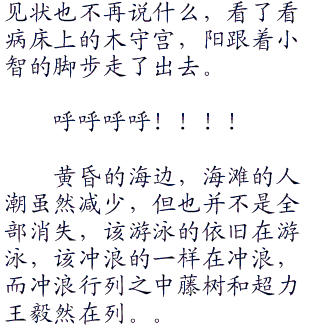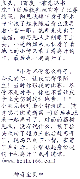小智没有再说话,小遥等人感受到了阳身上难以言喻的感觉,也是没有再多说,阳见状看向了一旁的场中,此时木守宫在就已经再度倒下了,体力已经彻底耗尽了。阳见状走进了场中。随后对着藤树和裁判说道。“这样子,应该算是木守宫输了吧!你可以宣布结果了!!”
