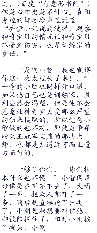 “小智,白银大会之后,我还以为你变得成熟了,没想到还是这个样子,实在是太让我失望了!”阳面无表情的俯视着小智冷声开口道。而小智捂着自己的脸,心中满是不甘心,大声的喊道。“你根本什么都不。”