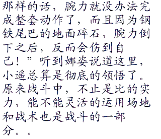 “腕力快点避开!”看到这一幕的藤树再度喊道,这一次的藤树,就算有冲浪的方法,也不敢轻易的接下钢铁尾巴了,但是利用冲浪的方式翻滚躲避还是很轻松了,腕力自身顺势倒下,随即,朝着后方滚去,木守宫的攻击再度击打在地面之上。这个时候阳的声音再度响起。“木守宫不要停下来,连续使用钢铁尾巴!!”
