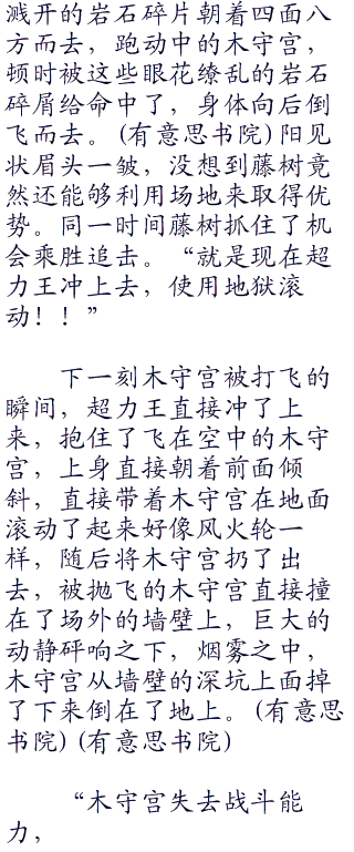 “维持电光一闪避开来扰乱超力王的方向!”阳见状连忙喊道。木守宫闻声,在要被百万吨拳击击中的瞬间,连忙闪避开来,随后来到了超力王的侧面,借助超快的速度躲避开来了,随后速度一点也没有下降的快速窜动着,在超力王的身边形成了一个银色的光圈,超力王的身体跟不上,但是在木守宫全力释放的速度下,眼睛也逐渐的没办法跟上了。