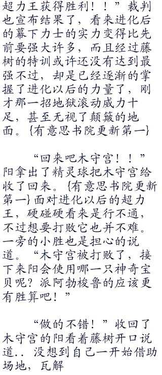 光芒闪耀着,出现在眼前的神奇宝贝,不出意外的正是超力王,经过昨天藤树的苦练,如今的超力王似乎变得比昨天更加有气势,一登场就发出了一声大吼,已经是一副蓄势待发的样子了,虽然藤树利用海浪躲避攻击的方法已经被破解了,但是,面对超力王,就算没有这个方法也不能大意。