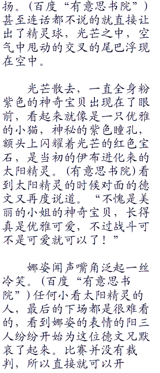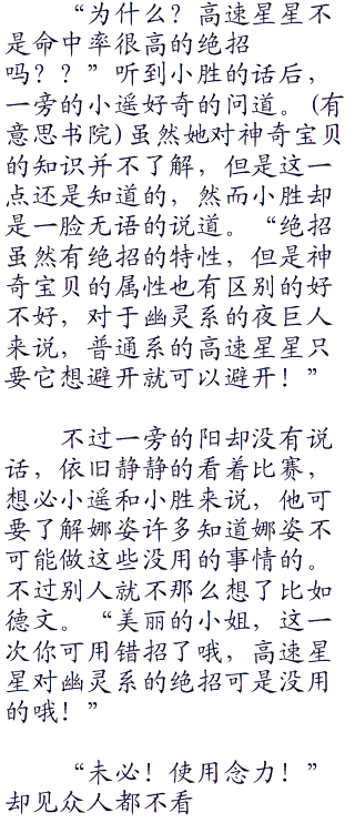 “好了美丽的小姐,接下来该轮到你了!”放出了自己的神奇宝贝后,德文又立刻抬起头露出自认为很绅士的表情来对娜姿说道。但娜姿却依旧神色如常没有一丝波动。平静的拿出精灵球,没有像德文一样张