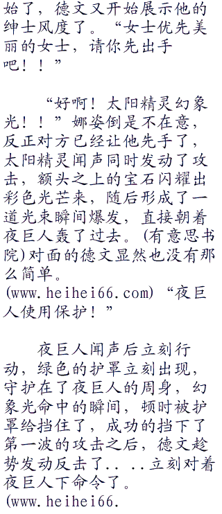“规则是一对一的比赛,任何一方先倒下就算谁输了,没问题吧美丽的小姐!”站在了场地上的德文得意的笑着说道。看起来很自信的样子,殊不知接下来就要倒霉了,而娜姿依旧是面无表情平静的回应道。在他看来,眼前这个家伙,就是个有钱的白痴而已。“没问题!!”