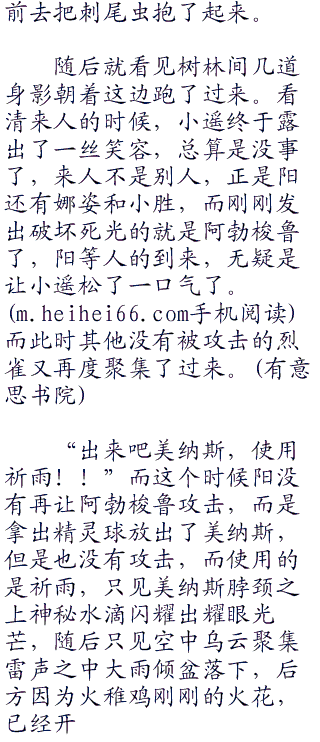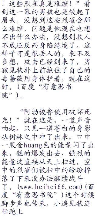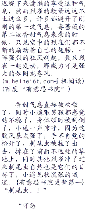 看着眼前一大片的烈雀袭来,男孩顿时开口对着身边的毒蔷薇喊道,只见毒蔷薇双手的花朵,释放出了一股粉色的气息,烈雀们扑面而来,撞向了粉色气息之后,纷纷好像失去了力气一样,原本冲击的速度变得慢了下来。男孩见状继续的喊道。“毒蔷薇继续使用香甜气息!!”