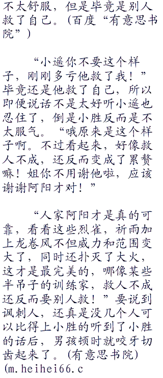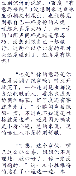 “原来你是想要狩猎凤蝶才来这里抓刺尾虫的啊?可是你为了抓刺尾虫弄成这样,看来还是个什么都不会的新手吧!不过看样子,闹了那么大动静,竟然连一只小小的刺尾虫都收服不了!”这个时候先前的那个男生走了过来了开口说道,语气听起来实在不怎么好,说起来就好像是怪小遥一样,不过现在的小遥也不能说什么,毕竟对方刚刚出手救了自己。