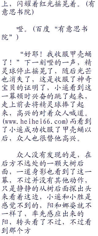 “甲壳蛹你怎么了??”被甲壳蛹的动作吓了一跳,小遥开口问道。只见甲壳蛹在草地上跳了跳,因为现在甲壳蛹基本上是不能动的,所以只能离地一点点距离的跳跃,同时发出了低鸣,站在旁边的阳见状,听着甲壳蛹的声音,随后笑着说道。“小遥,我想甲壳蛹是希望你带它一起走吧!”